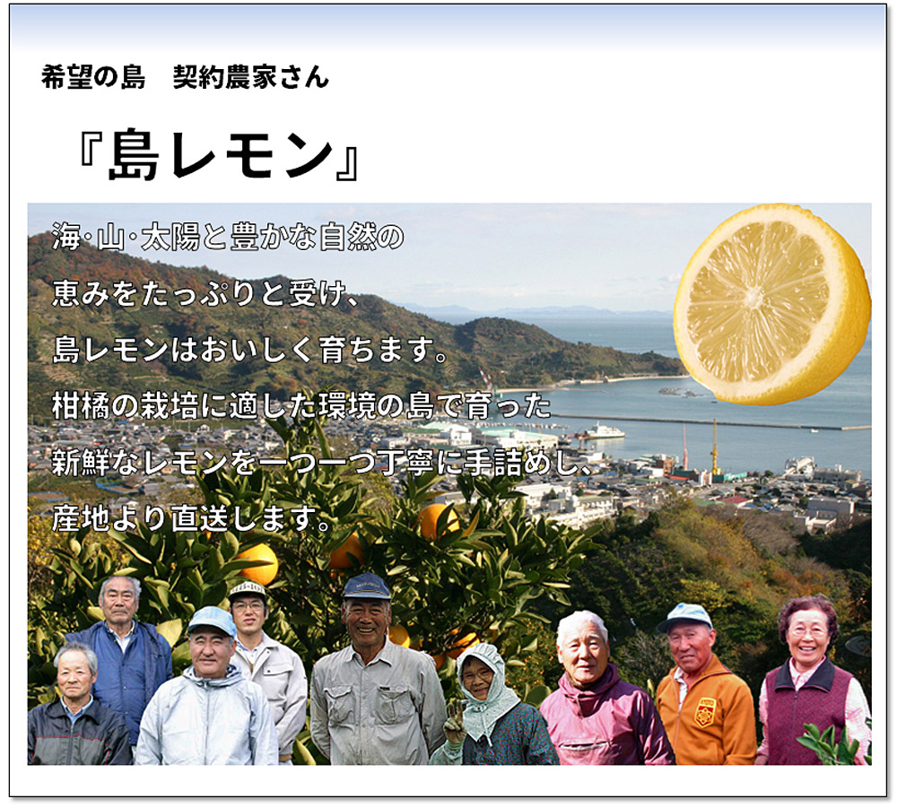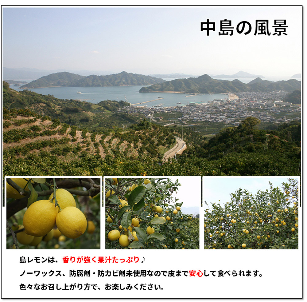 | 瀬戸内海の西方、穏やかな自然に育まれた『中島』の柑橘ブランド「希望の島」 こちらのレモンは栽培期間中、無農薬で栽培されており、ワックス、防腐剤、防カビ剤なども不使用のため安心して皮までお使い頂けます。 キラキラときらめく太陽の恵みをいっぱいにうけたレモン。 『お口に広がる瀬戸内海』そんな光景が浮かぶ、レモンづくりを目指しております。 【レモンの特徴】 お菓子・ドリンク・調味料など幅広い用途で、果肉・果汁・ピールと余すことなく利用できます。 時期によっては、色・味・果汁量が変わりますので、お好みのレモンを見つけられるといいですね! 10月〜グリーンレモン、12月頃〜イエローレモンに色が変わっていきます。 ■品名:国産レモン ■仕様:無農薬・ノーワックス・防腐剤不使用 ※こちらの商品は農薬不使用のため、外観がよくない場合もございます。予めご了承くださいませ。 ■品質基準:家庭用 ■生産地:愛媛県中島大浦 ■内容量:約2kg ■サイズ:おまかせ(Sサイズ〜2Lサイズ) ■発送方法:常温/クール便(有料) ※生産者(瀬戸内海の離島)より産地直送されます ※賞味期限:10日程度(保管方法によります) ※保存方法:風通しのよい冷暗所(暖かい場所は避けて下さい) ※1kgあたりの玉数目安 S(小玉):10玉前後 M(中玉):8玉前後 L(中玉):7玉前後 2L(大玉):5玉前後 ※個体差やバラ詰めで玉数は前後します。 ■代金引換はお受けできません 決済システム上では代金引換が選択できますが、こちらの商品にはご利用いただけません。 商品の性質上、置き配はご利用頂けません。ご指定されましてもお受け出来かねますため、予めご了承下さい。 ■同梱および、ご注文につきまして こちらの商品は、送料無料にて契約農家から発送いたします。「産地直送品」になりますので、他商品との同梱発送はお受けできません。 ご注文確認後に商品の手配を開始いたしますので、ご注文内容のご変更やキャンセルはお受けできませんので予めご了承くださいませ。 ■到着までの日数 発送後、中一日(青森県・岩手県・秋田県・宮城県・山形県・福島県・北海道・沖縄県)、その他の都道府県は翌日着予定。但し、離島・一部地域を除く。 [2510r] |