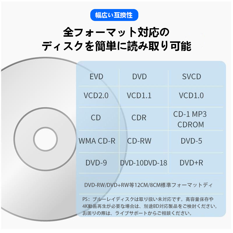 対応メディア: CD-R、CD-RW、DVD-R、DVD-RW、DVD±R DL、DVD-ROMなど