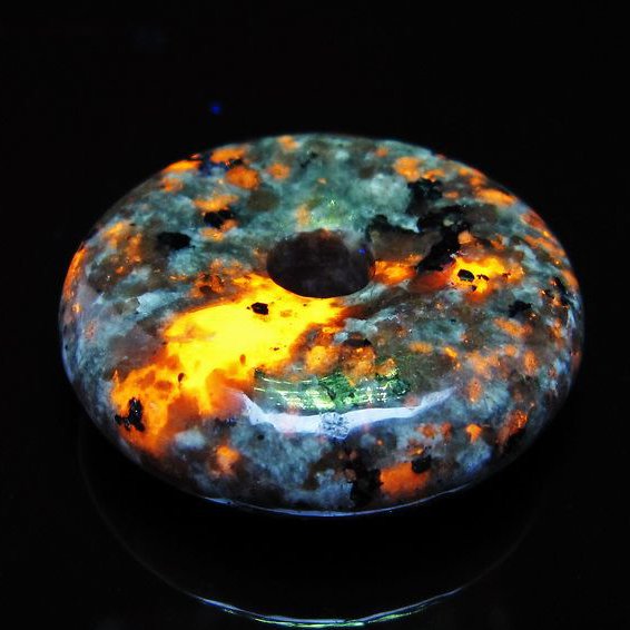 自然光の下では変哲の無い石ですが、ブラックライトなどの紫外線を照射すると強いオレンジ色の蛍光が確認できます。