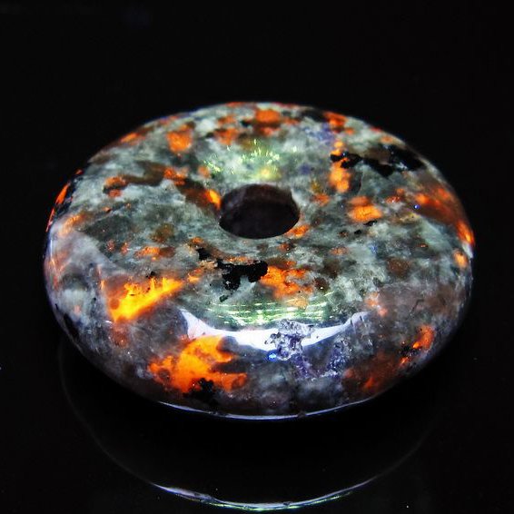 自然光の下では変哲の無い石ですが、ブラックライトなどの紫外線を照射すると強いオレンジ色の蛍光が確認できます。