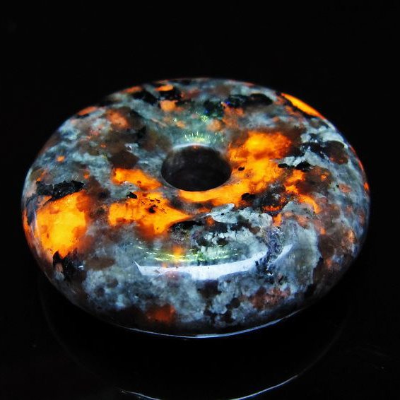 自然光の下では変哲の無い石ですが、ブラックライトなどの紫外線を照射すると強いオレンジ色の蛍光が確認できます。