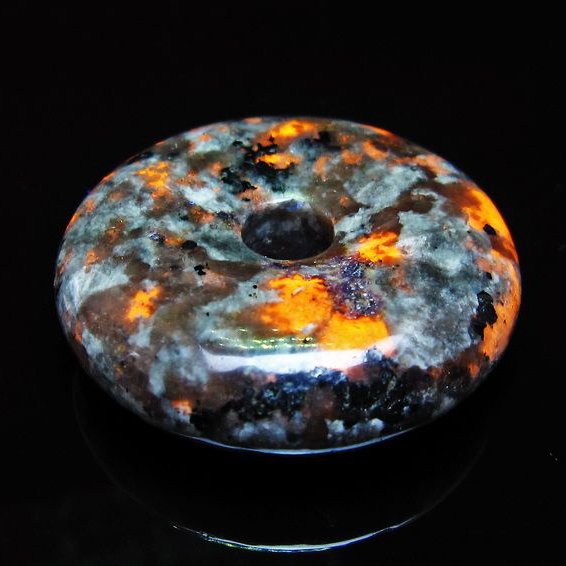 自然光の下では変哲の無い石ですが、ブラックライトなどの紫外線を照射すると強いオレンジ色の蛍光が確認できます。