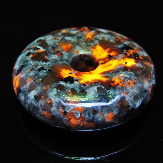 自然光の下では変哲の無い石ですが、ブラックライトなどの紫外線を照射すると強いオレンジ色の蛍光が確認できます。