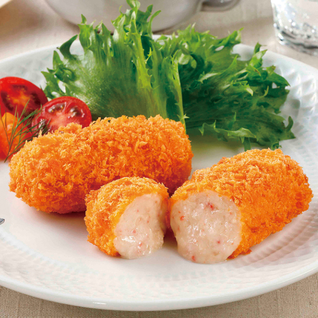 自社製のルーと宮城県蔵王産のミルクを使用して、なめらかなソースに仕上げたクリームコロッケです。ミルクの甘みとかにの風味が感じられる、とろっとしたクリームが特徴です。独自技術により、時間が経ってもクリームのなめらかさが持続するよう仕上げました。サクッとした食感が続く、独自の衣を採用いたしました。