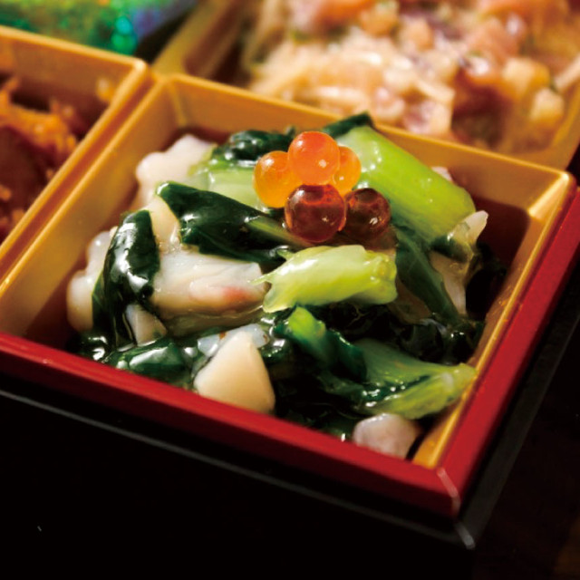 存在感のある食感のシマダコを小松菜と合わせた和風和え物です。