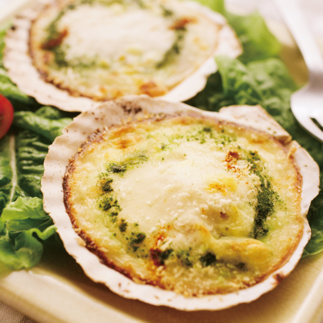 本物の帆立殻を器に使用し貝柱が2粒入った、旨みと弾力のある食感が絶妙な味わいです。モッツアレラチーズを贅沢に使用。