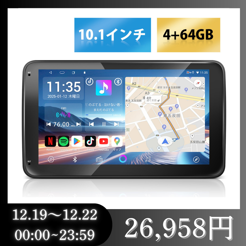ディスプレイオーディオ 10.1インチ androidシステム 4+64GB カーオーディオ 1DIN ワイヤレス carplay android auto Bluetooth5.0 FM DSP リバース連動 KAR10C