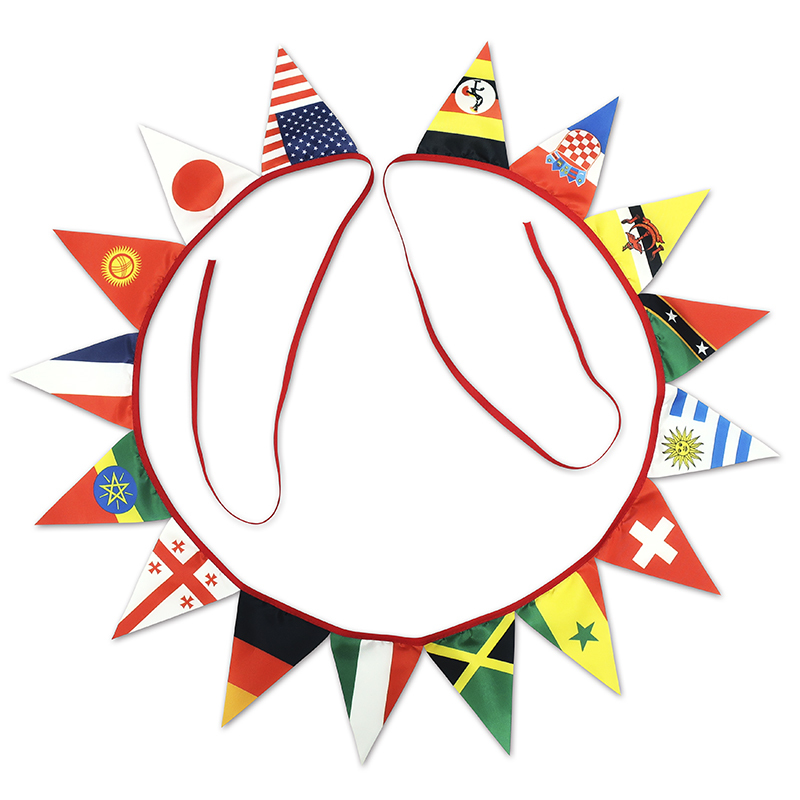 世界の国旗をあしらったカラフルで目を引く国旗柄風フラッグガーランドです。