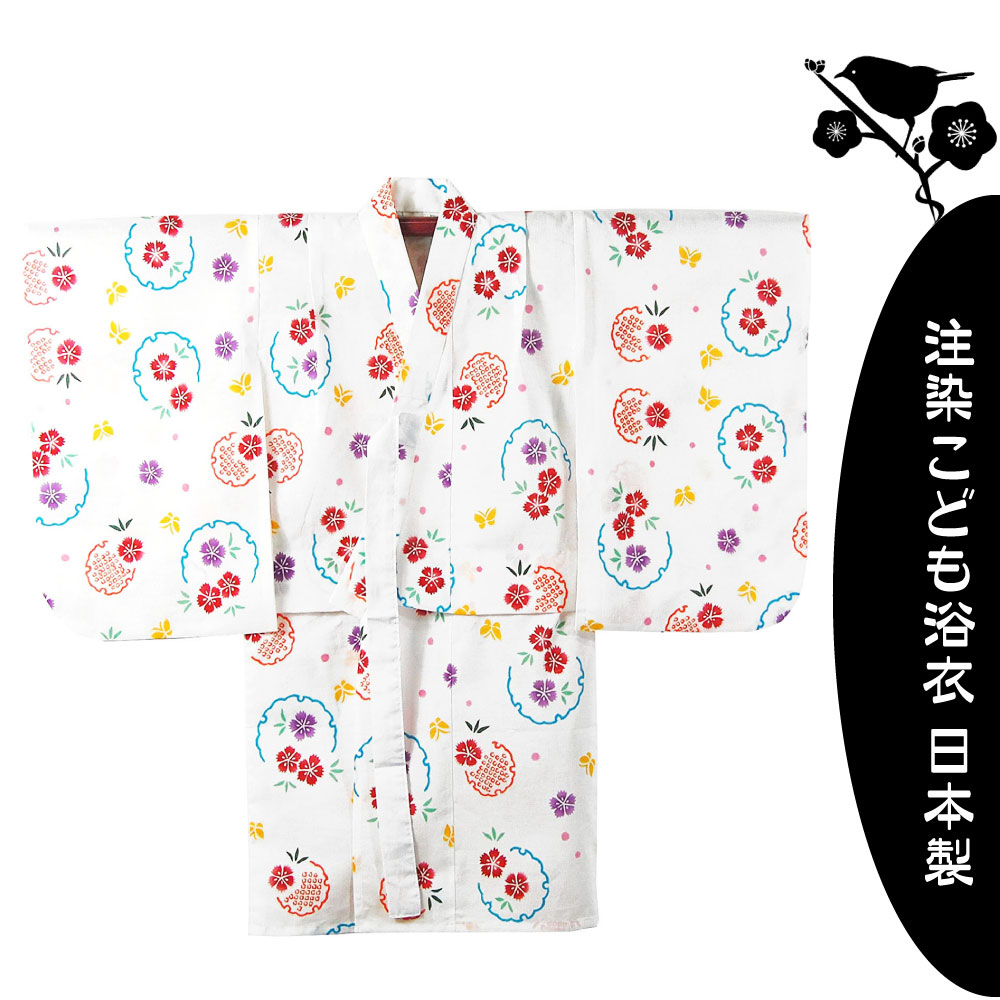 本染注染 こども浴衣 雪輪なでしこ 白地 日本製 女児120センチ 7・8歳用