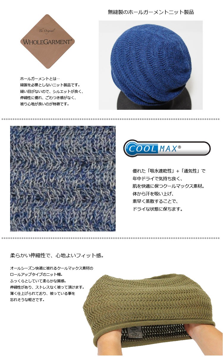 国内の工場で丁寧に仕上げられた日本製のニット帽。素材には優れた吸水速乾性と通気性を持つクールマックス素材を使用。無縫製でつくられた、被り心地とシルエットの良いニット帽です。