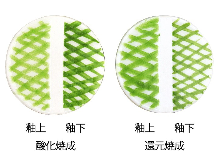 | 備考 | 混色は可能ですが、必ずしも混色した時の見た目の色が発色するとは限りません。混色の内容や比率などによって想定外の発色になる場合もあります。テスト焼成をお薦めします。 ご使用いただく釉薬によっては、色の重なりで違った色に見えたり、釉薬に含まれる成分との反応で変色したりする場合もあります。テスト焼成をお薦めします。 |