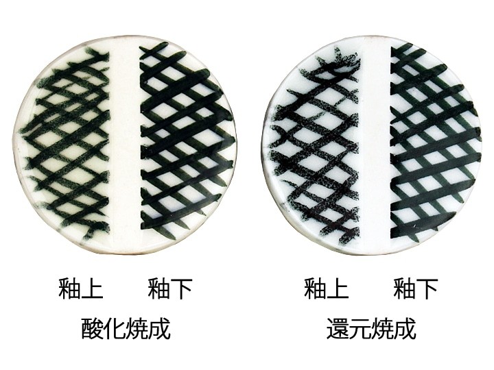 ●釉薬の上にも下にも施せるように特別に調合した下絵具です。通常の下絵具のように、素焼き素地の上に絵付けして透明性の釉薬を施釉して焼成する事も出来ます。また、透明釉、乳濁釉、マット釉、カラー釉などの上に絵付けして焼成する事も出来ます。 ●釉上に施せば、上絵付けに似た作風に仕上げる事ができます。 ●幅広い釉薬で安定した発色が得られます。また、酸化焼成・還元焼成のいずれの雰囲気でも良好な発色が得られます。 | |