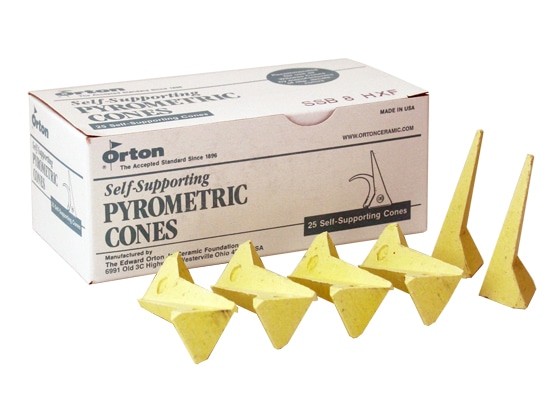 | 使用方法 | ●オルトンコーンは2本1組で製造され、2本のコーンが繋がった状態で納品されます。 ●2本のコーンが繋がっている部分から切り分けて使用します。繋がっている部分の両側にカッターやハサミなどの刃物で数回ほど切り込みを入れます。切り込みに沿って慎重に力を加えて2本を切り分けます。 ●セルフサポーティングコーンは最適角度に傾斜した状態で自立できるため、そのまま測定したい場所に置きます。 ●目的の焼成に適したオルトンコーンを真中に、両側にそれより一番手低いコーンと一番手高いコーンの3本を立てて使用するのが一般的です。 ●焼成時の熔倒具合によって温度や熱量などを推測します。 ●廃棄する場合は、「ガラスくず・コンクリートくず・陶磁器くず」として各自治体の規定に従って処分してください。 |