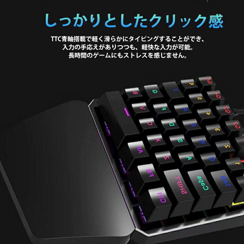 | [片手ゲーミングキーボード K9] メカニカルスイッチ青軸は、打鍵感や打鍵時のキー反発力の一貫性という点でも優れています。 人間工学に基づいた設計で、エンジニアリングハンドケアを採用しています。 優れた感触を体感でき、手首にぴったりとフィット! 長時間の使用でも疲れにくい。 心地良い打鍵音と軽いキータッチでよい打鍵感を実現します。 長時間の激しいゲーミングでも快適に楽しめます。 FPS、TPS、RTS、RPGのようなゲームにおいては、キーボードやマウスの感知性能がハッキリと結果に表れます。 有線接続することにより、指示の遅延を最大限に防ぎます。 プラグアンドプレイ対応で、WindowsPCのUSBポートに接続すると自動で設定されます。 滑り止めと防水デザイン、キー文字はレーザーエッチング加工がされています。 2000万回以上の耐久テストをクリアしました。 [ゲーミングマウス H3] バックライト付きで、ゲーム時のモチベーションも上がります。 バックライトは呼吸モードで点灯します。(特定の色で設定することはできません) ゲーム中にDPIを4段階に変更できます。変更できるDPIは、800/1600/2400/3600 です。 |