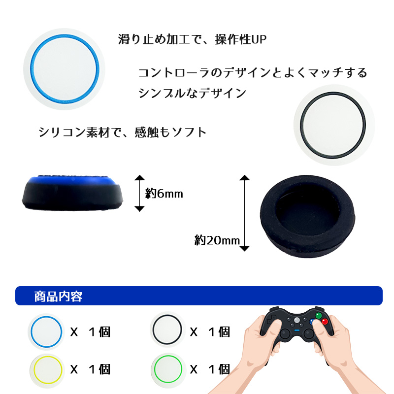 | コントローラ専用アナログスティックカバー×4点 内訳:白地イエロー×1点/白地グリーン×1点/白地ブラック×1点/白地ライトブルー×1点 |