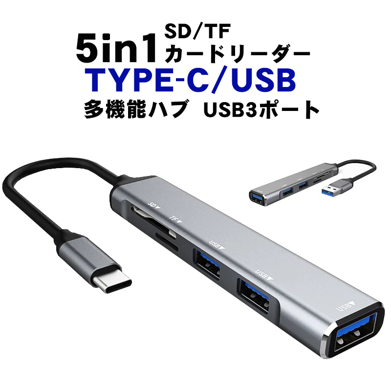 5in1マルチハブ USB TYPE-C TF SDカードリーダー USB3ポート ノートパソコン PC OTG スマホ 変換 コンパクト |