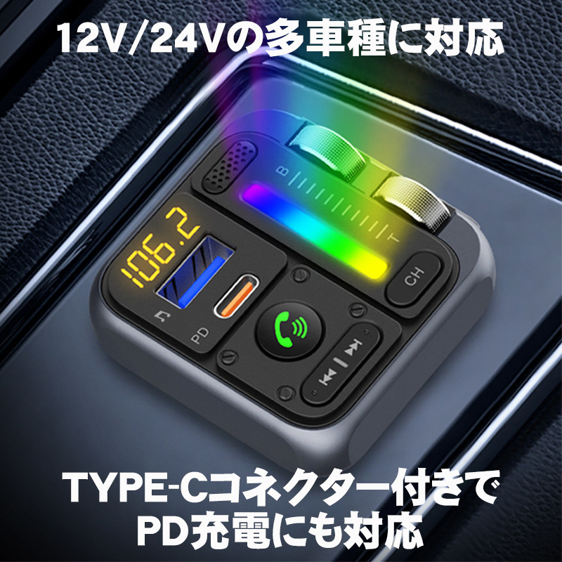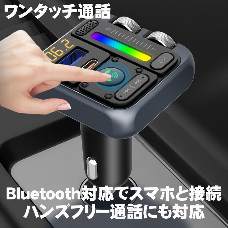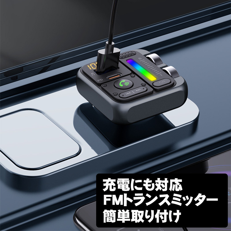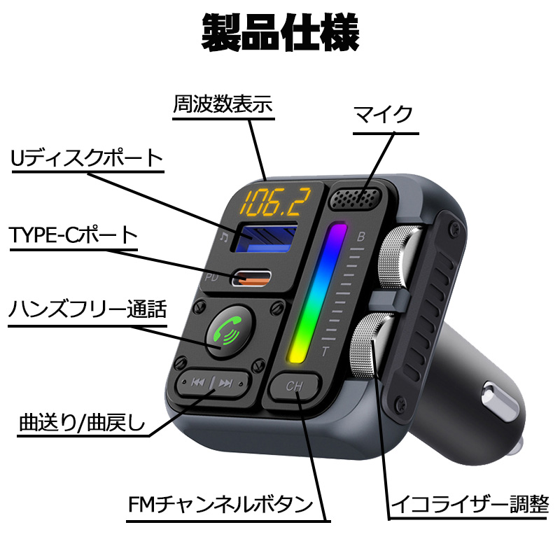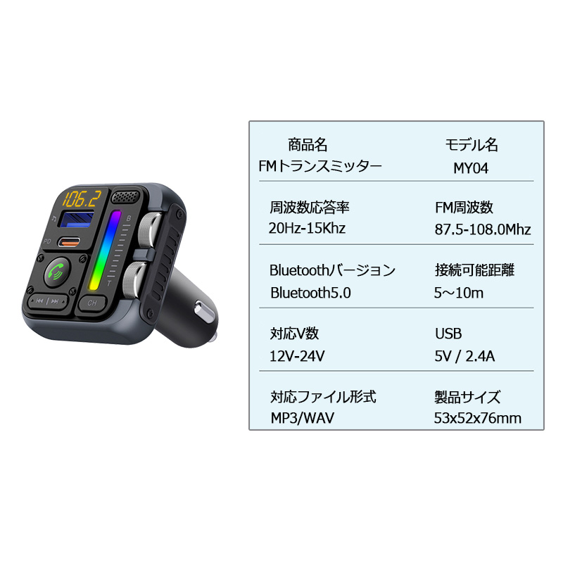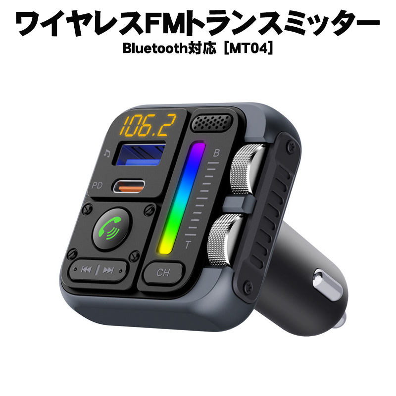 | FMトランスミッター [MT04] Bluetooth TYPE-C ポート 急速充電 LED付 シガーソケット 12〜24V車対応 携帯 音楽 無線 スマホ iPhone各機種 対応 |