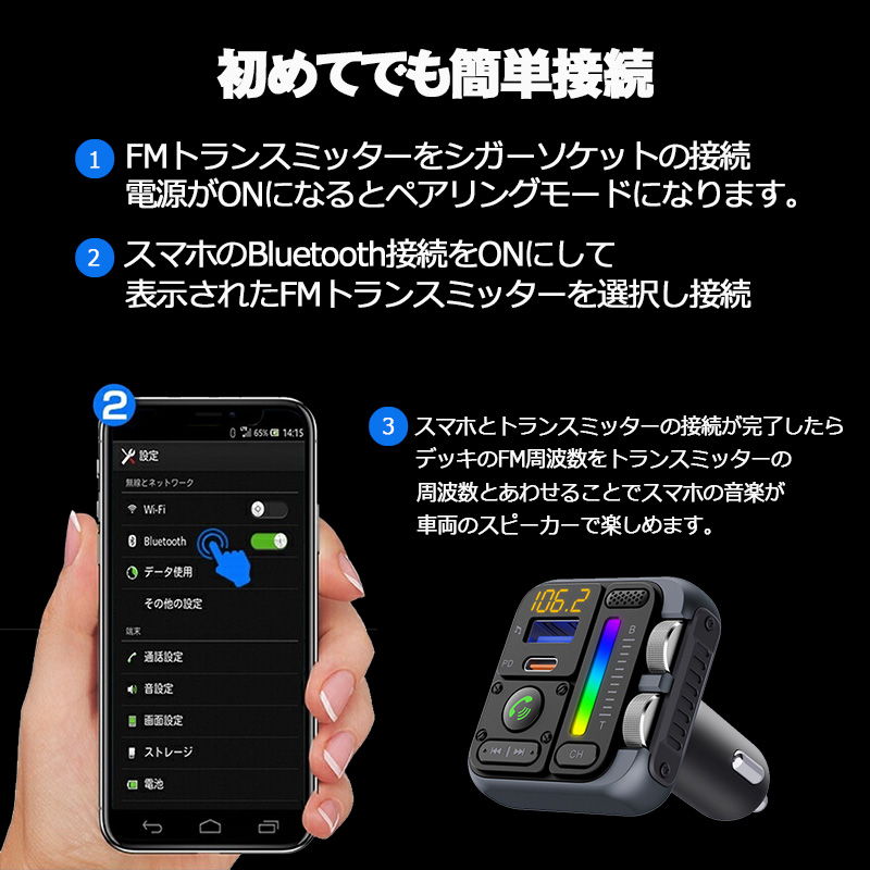 | 【Bluetooth5.0接続】 Bluetooth5.0を搭載した車載FMトランスミッターは通常製品より安定した通信で、クリアな音質を再生 5V/1A多機能USBポートUSB-Cも付き、3台のデバイスを同時に充電 【2つの再生モード】 2つの音楽再生モード:Bluetooth(Android、Appleのスマホなど全てのBluetoothデバイスに対応) USBメモリー(32GBまで)から音楽再生が可能 【ハンズフリー通話】 ハンズフリー通話にすることで、より安全な運転が可能になります ■操作説明■ 1.初期設定の手順について:車のアクセサリーをONにし電源を入れ、本体のCHボタンを押します FMの受信する番号を決定し、カーステレオ側のFMもその番号に合わせます 2.スマホのBluetooth項目の接続できるデバイスの中にメディアデバイスが表示されるのでペアリングを許可します これでスマホ内の音が、全て車のスピーカーから出るようになります 3.音量調節は本体の ← → ボタンを長押しと、スマホ側の音量、そしてカーステレオ側の音量の3つで決めることになります 基本的に本体は音量が最大になっているので、スマホ側の音量調節かカーナビやカーステレオの音量調節で音量を決めます 4.エンジンを切ったり、車を離れたりするとBluetoothが切断になり音楽再生も自動的にオフになります 5.次回からはスマホのBluetoothをONにしておくだけで自動的にペアリングされます。本体の ← → ボタンで曲のスキップもできます |
