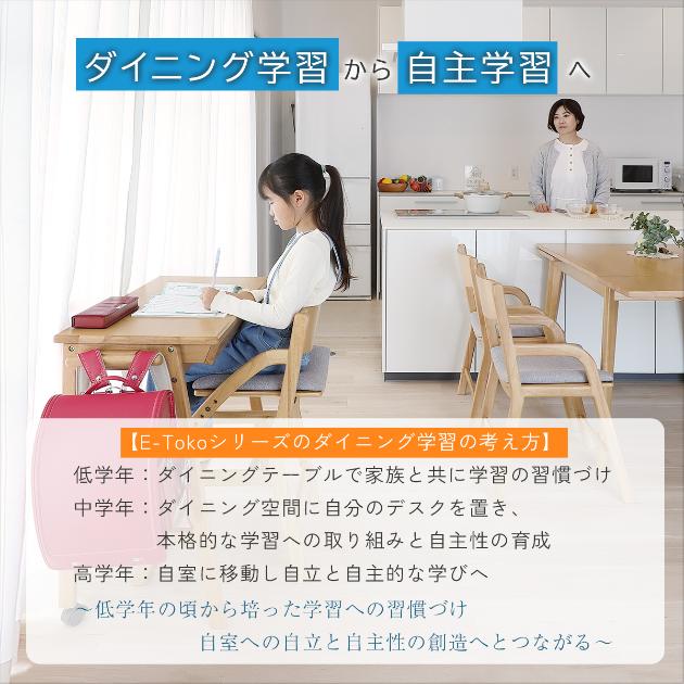 自主性の向上、本格的な学びへ。ダイニング学習から自室への自立をサポートする、E-tokoデスクシリーズ。キャスター付きのラックは移動がしやすく色々な場所で使用できます。