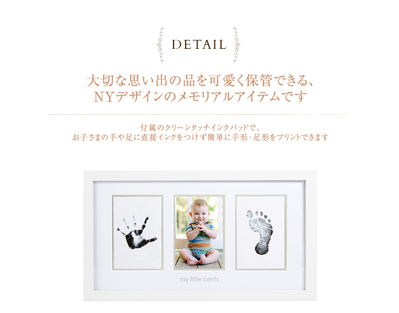 備考:★手形と足型を両サイドに入れられるフォトフレーム。大切な思い出の品を可愛く保管できる、NYデザインのメモリアルアイテムです。