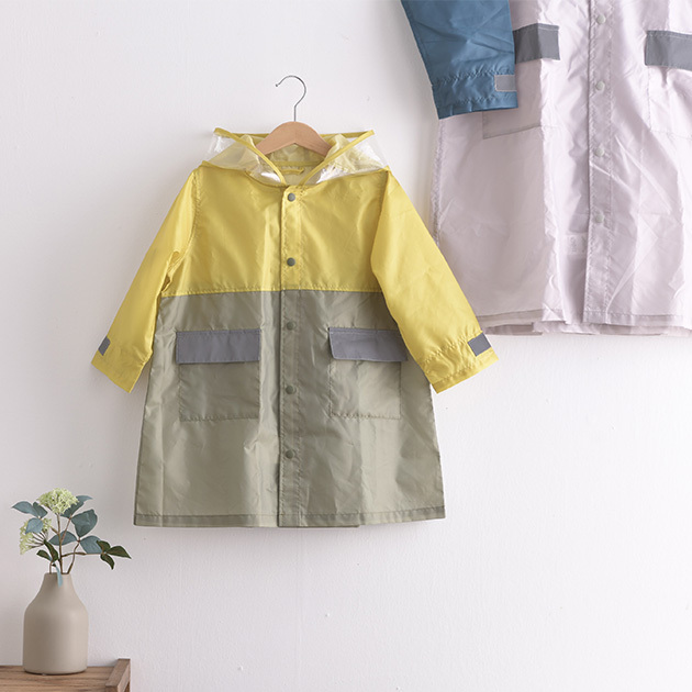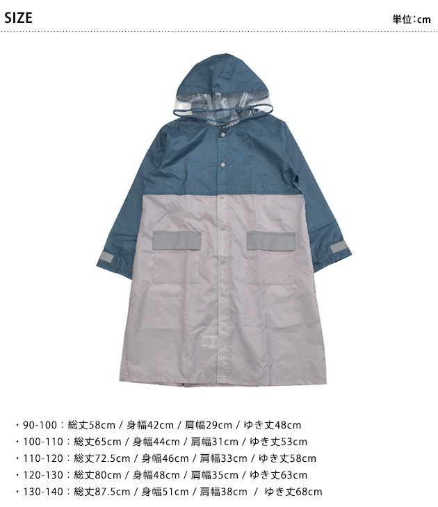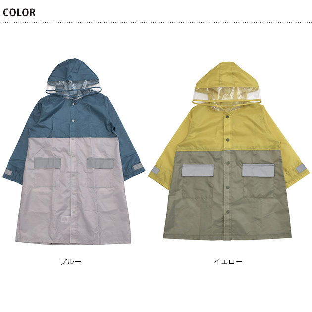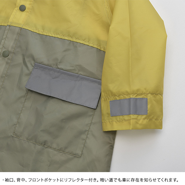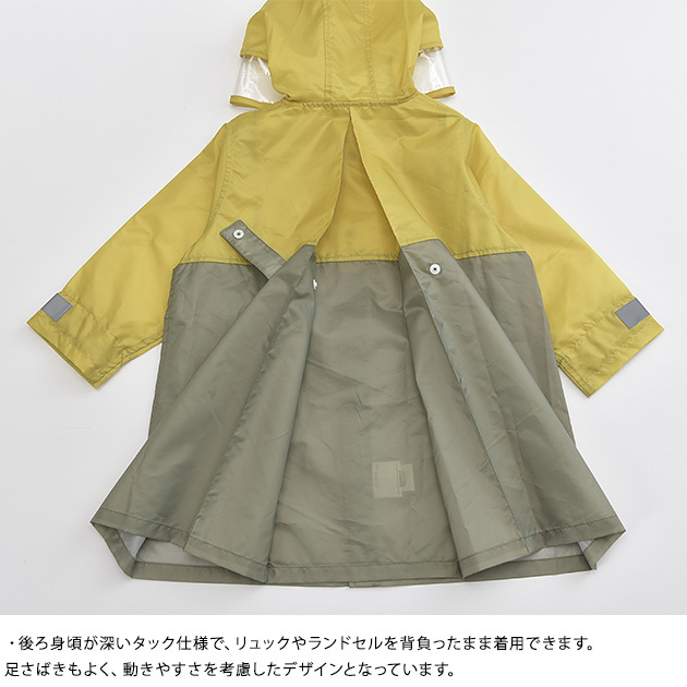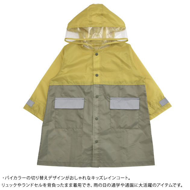 ・バイカラーの切り替えデザインがおしゃれなキッズレインコート。リュックやランドセルを背負ったまま着用でき、雨の日の通学や通園に大活躍のアイテムです。