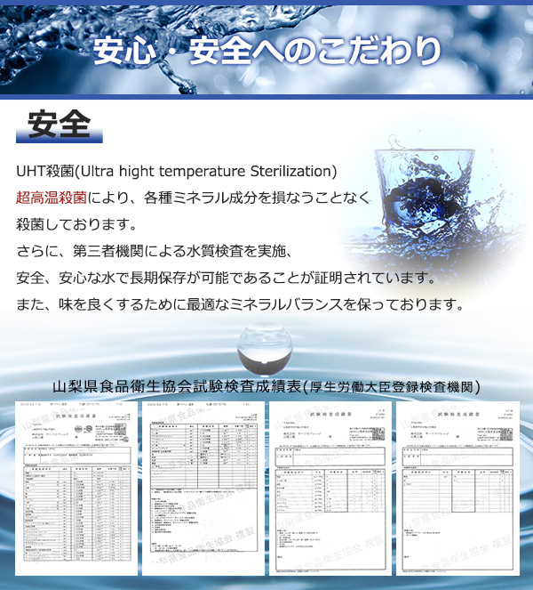 保存期間表記の適正性について、厚生労働大臣登録検査機関である「山梨県食品衛生協会」による水質検査を実施しております。