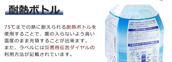 75度までの熱に耐えられる耐熱ボトルを使用することで、菌の入らないよう高い温度のまま重鎮することができます。また、ラベルには災害用伝言ダイヤルの利用方法が記載されています。