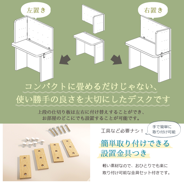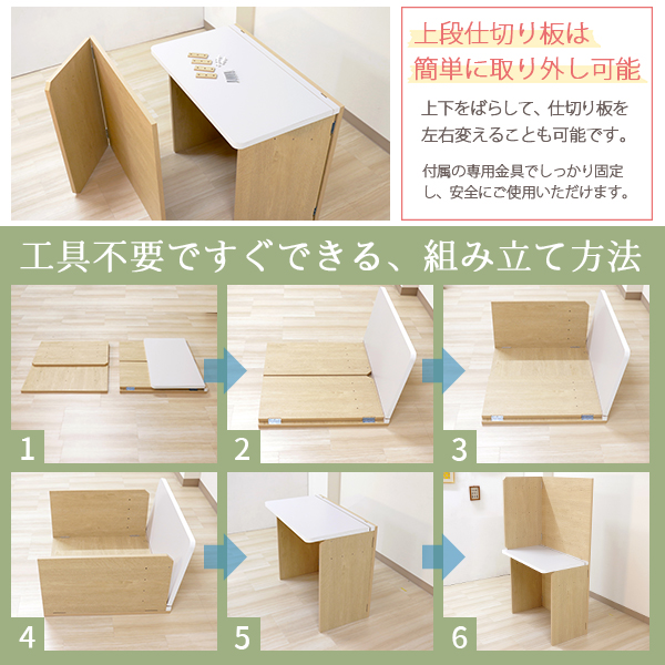 上段の仕切り板は左右に付け替えすることができ、