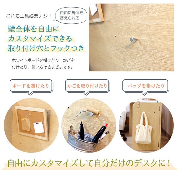 壁全体を自由にカスタマイズできる取り付け穴とフックつき