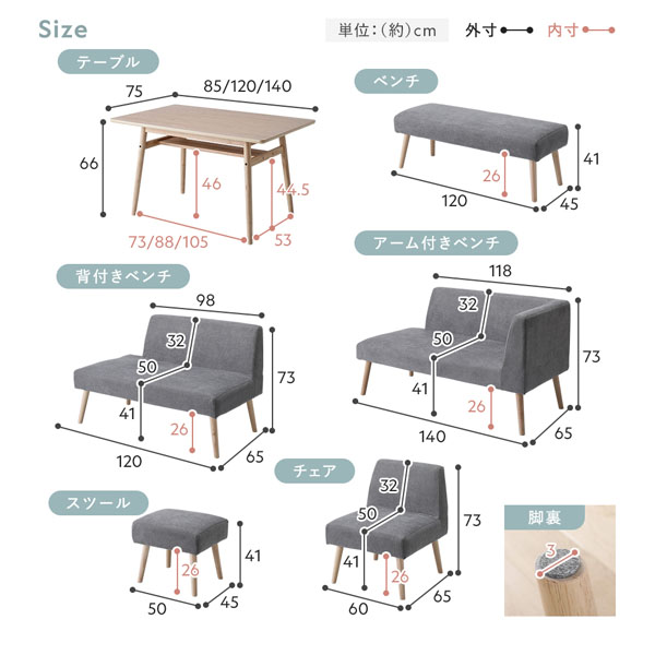 背付きベンチ(左右共通):幅120×奥行65×高さ73cm(座面高41cm)