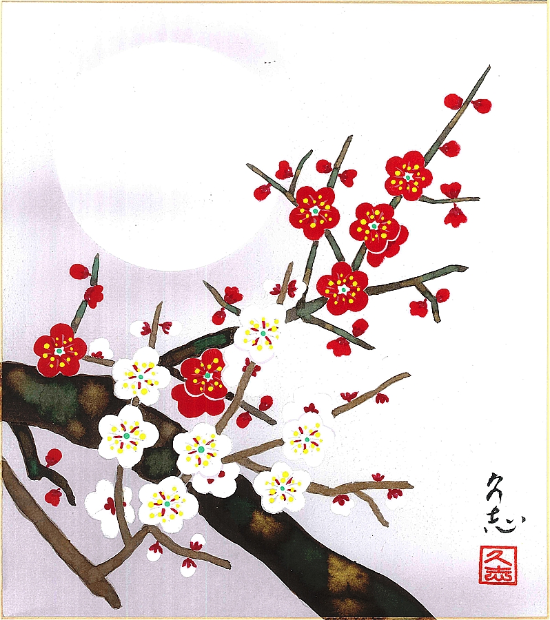 色紙(冬)奥田 久志作画「紅白梅」 色紙寸法24.2X27.2cm