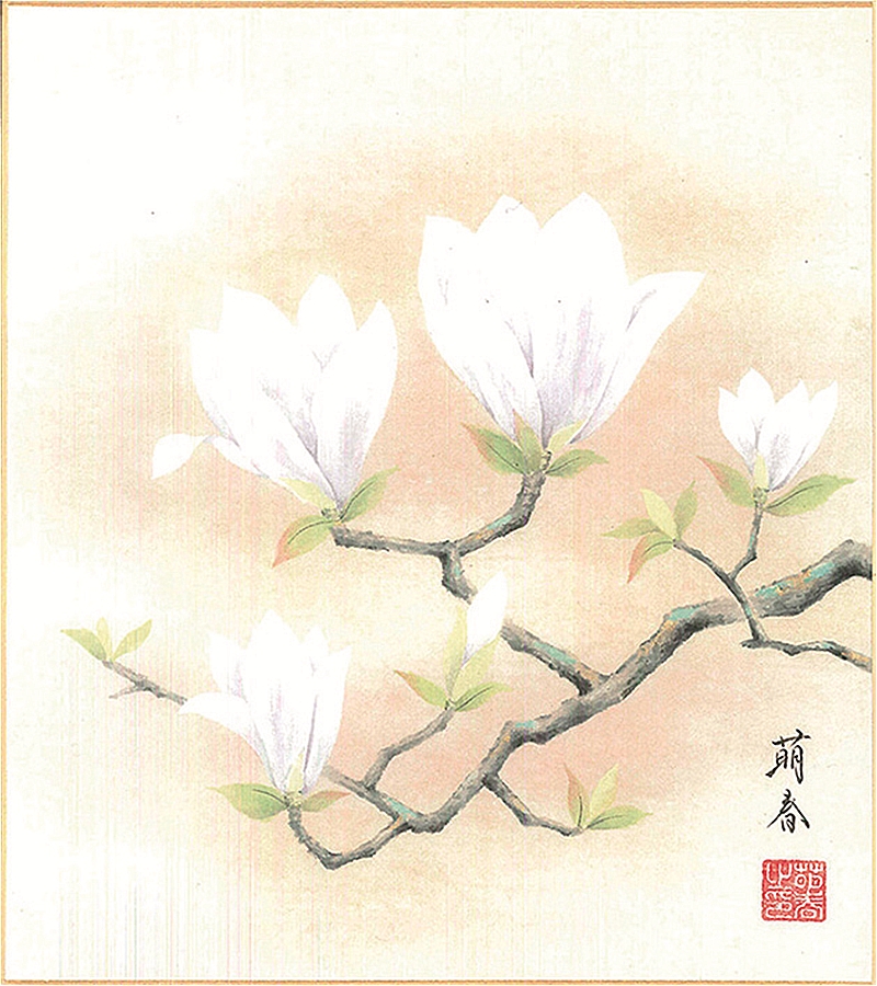 色紙(春)奥田 萌春作画「木蓮」 色紙寸法24.2X27.2cm