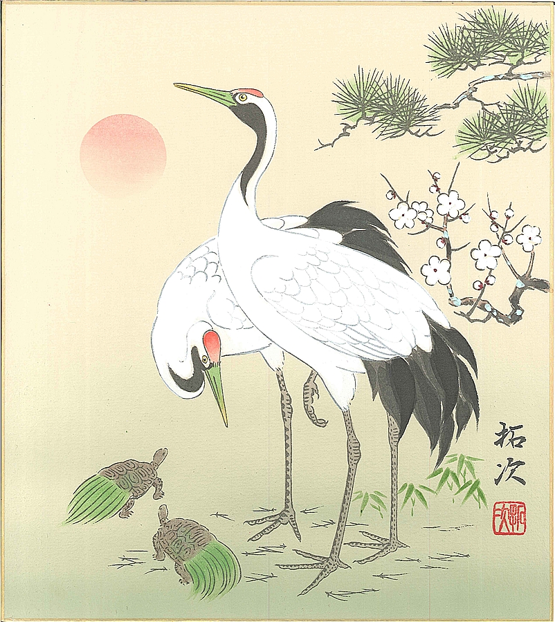 色紙(年中 その他)夏目 拓次作画「松竹梅鶴亀」 色紙寸法24.2X27.2cm
