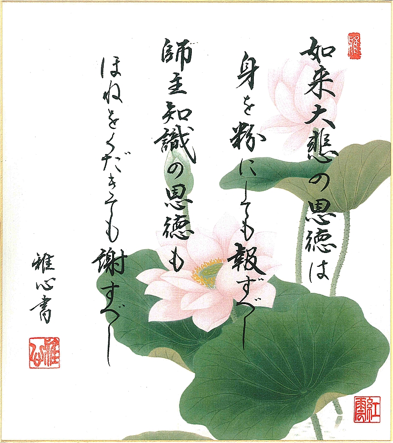 現代仏壇用硯屏(工芸色紙) 「恩徳讃(紅雲 邪心 作画)」 額縁寸法24X27cm