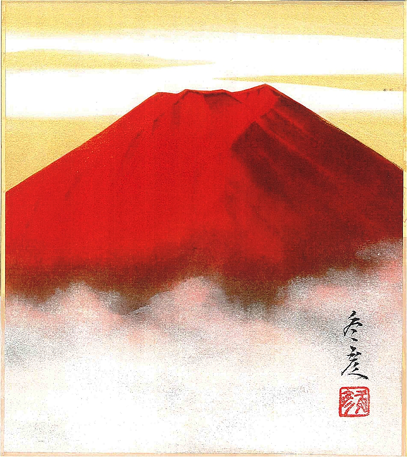 寸松庵色紙(年中)柳原 年中彦作画「赤富士」 寸松庵寸法13.6X12.1cm