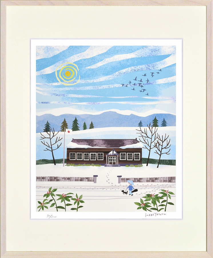 ジークレー版画 額装絵画 はりたつお作 「里山学校と冬鳥」 四ッ切