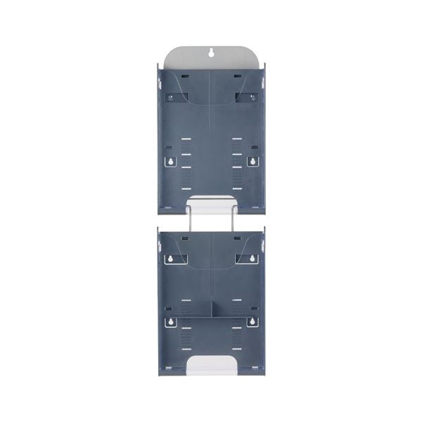 ケース内のサイズをA4以下に変えられるパンフレットケースシリーズのパンフレットケース(2段)。上部のスチール板を壁面に取り付けて使用できるほか、付属のパーティション用フックを使えば、パーティション上部からケースを吊るして使用することができます。また付属のサイズチェンジパーツを使うと、A4サイズ以下(A4三つ折・B5・B6・A6・ハガキ)のパンフレットも上辺を揃えてきれいに収納することができます。ケースの表側はパンフレットの表紙がよく見えるクリアタイプ。