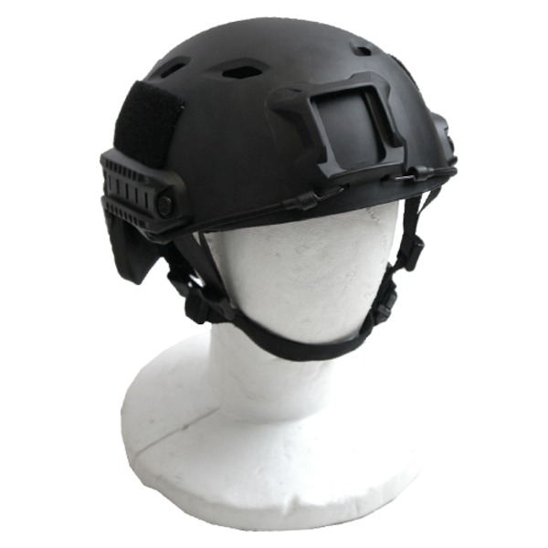 アメリカ空挺部隊FASTヘルメットを再現したアイテムです。素材は軽量かつ耐衝撃性に優れたABSプラスチックを使用。後頭部のダイヤルで頭周りのサイズの調節ができます。調節用のパッドが付属しており、お好みのフィッティング感に出来ます。サイドレールが装備されているので、いろいろな装具を取り付けることができ、サバイバルゲームなどで大活躍しそうなアイテムです。
