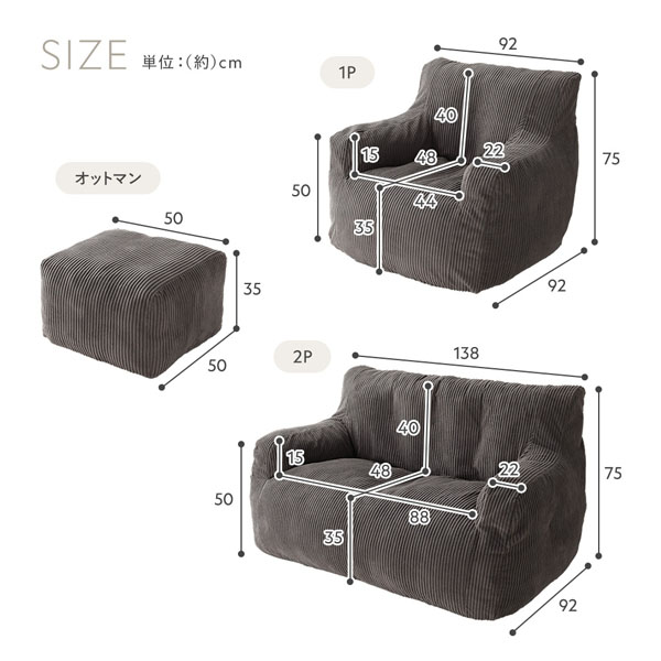 1人掛けソファ:幅92×奥行92×高さ75cm(座面高:35cm)