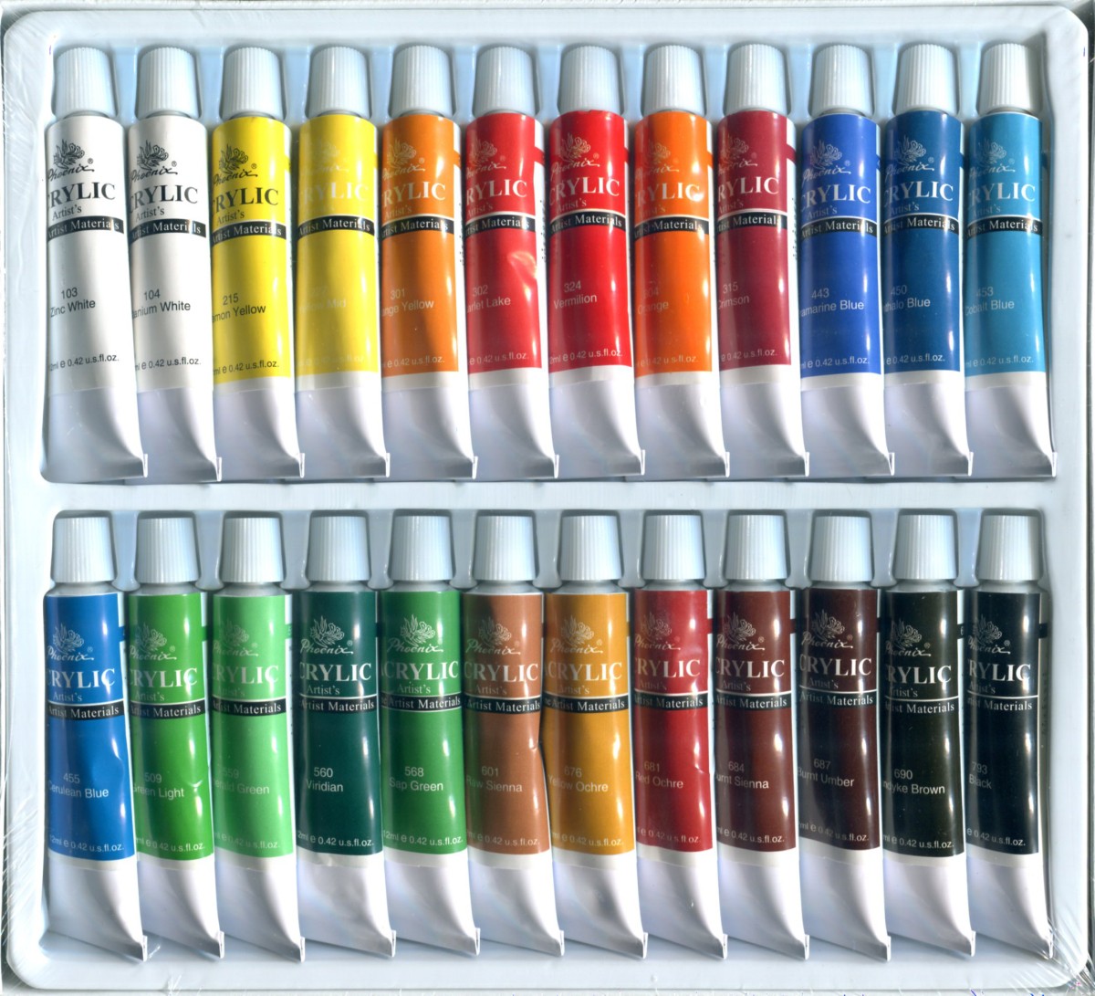 Zinc White/Titanium White/Lemon Yellow/Yellow Mid Orange Yellow/Scarlet Lake/Orange/Crimson Vermilion/Ultramarine Blue/Phthalo Blue/Cobalt Blue Cerulean Blue/Green Light/Emerald Green/Viridian Sap Green/Raw Sienna/Yellow Ochre/Red Light Bumit Sienna/Bumt Umber/Vandyke Brown/Black |