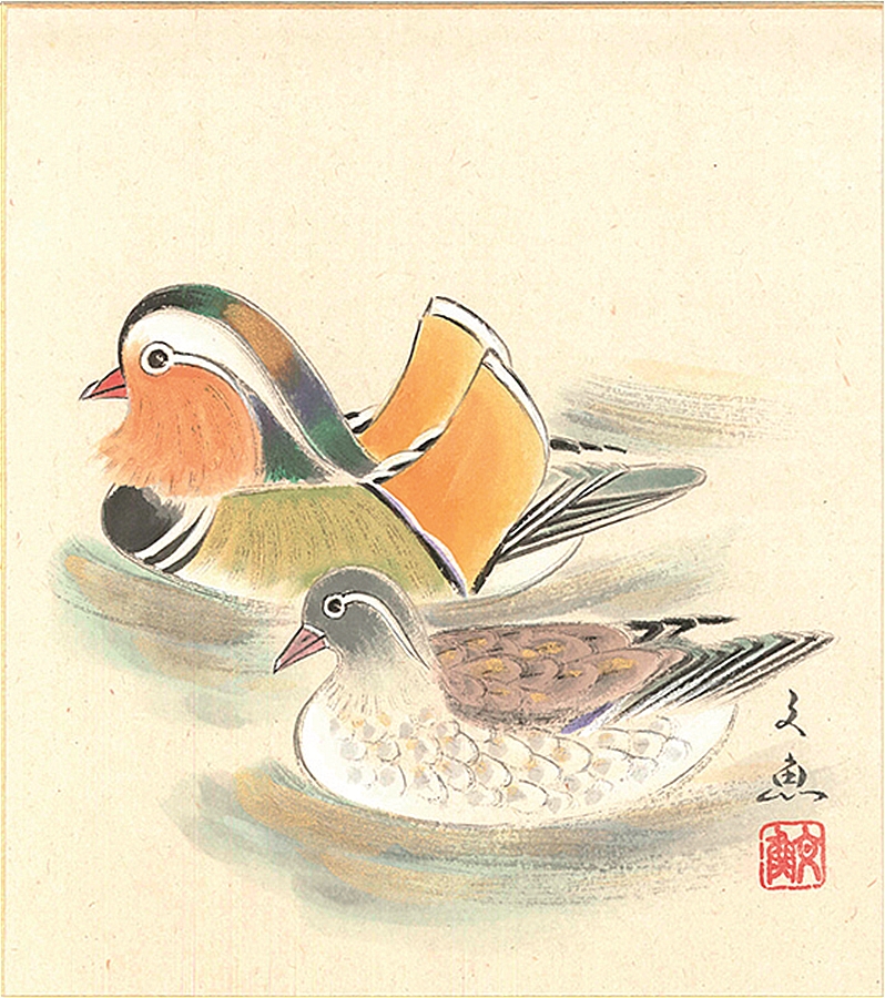 色紙(冬)中谷 文魚作画「おしどり」 色紙寸法24.2X27.2cm