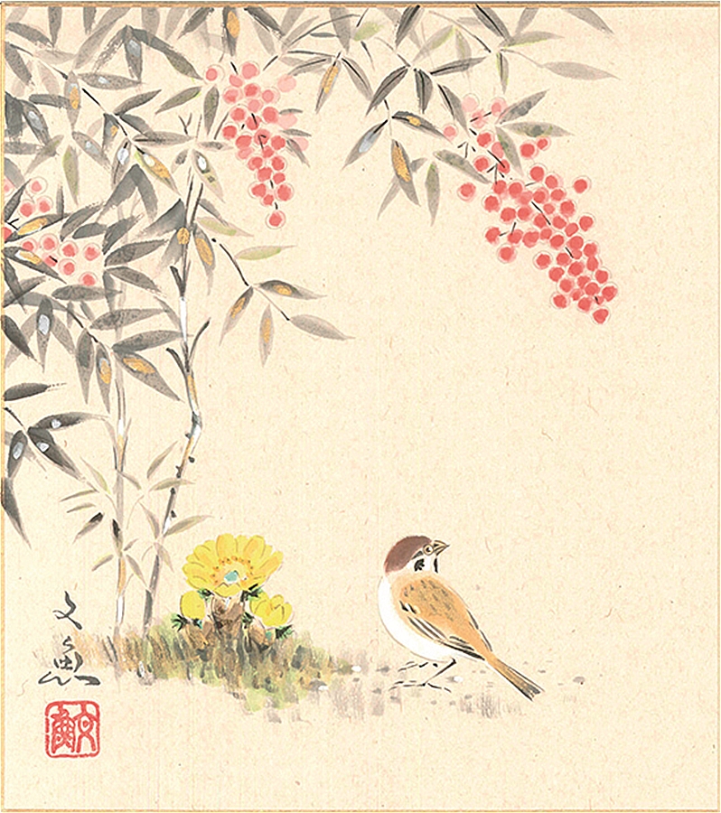 色紙(冬)中谷 文魚作画「南天福寿」 色紙寸法24.2X27.2cm
