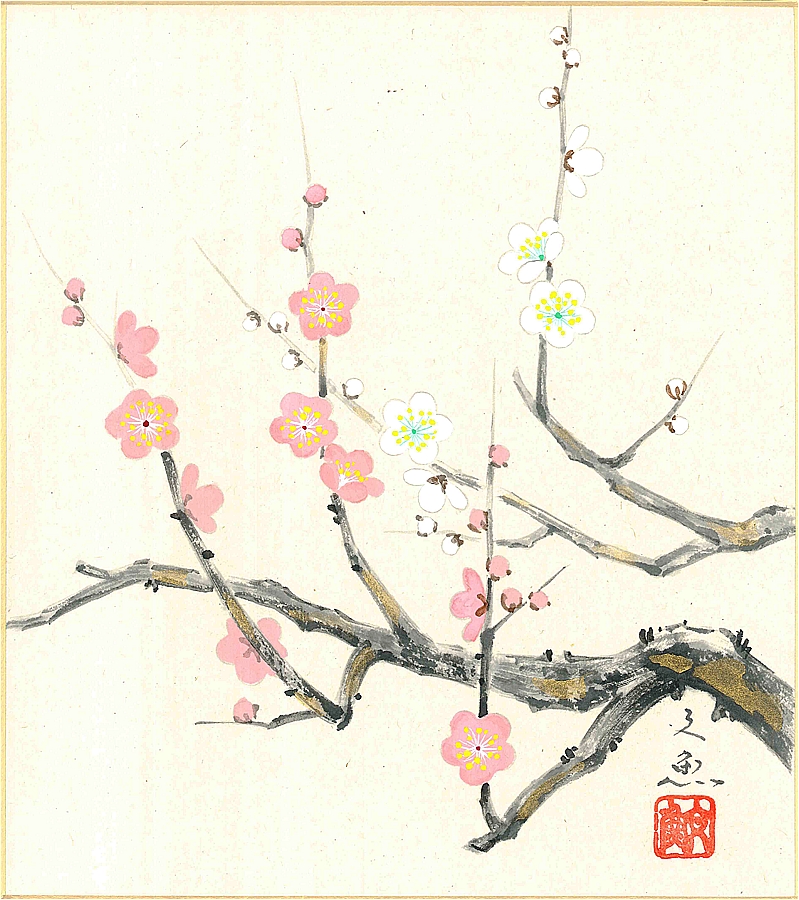 色紙(冬)中谷 文魚作画「紅白梅」 色紙寸法24.2X27.2cm