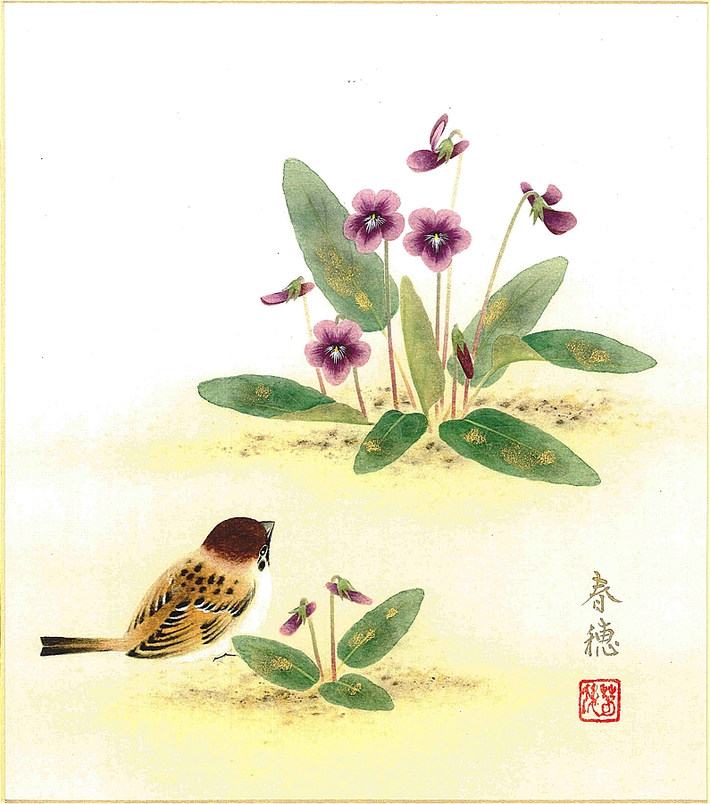 色紙(春)藤田 春穂作画「菫に雀」 色紙寸法24.2X27.2cm
