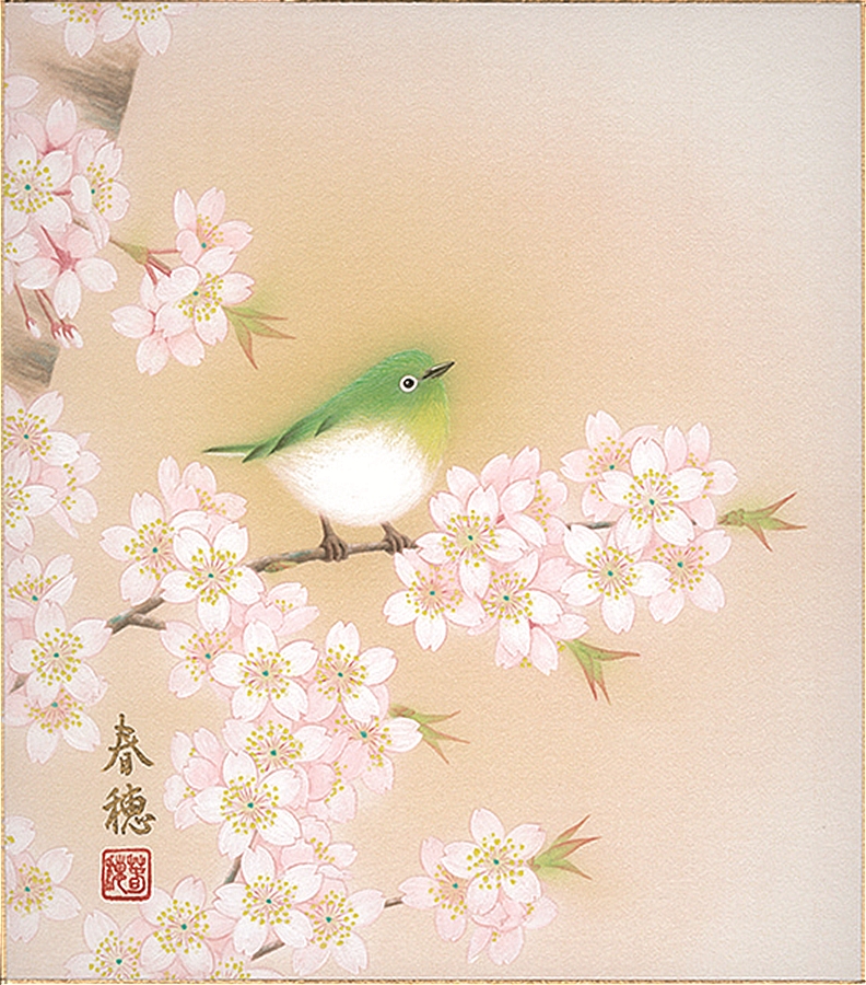 色紙(春)藤田 春穂作画「桜に小禽」 色紙寸法24.2X27.2cm