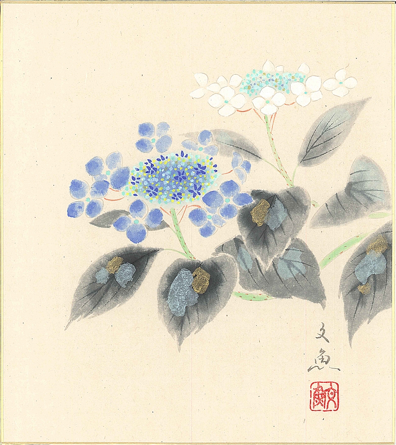 色紙(夏)中谷 文魚作画「額紫陽花(白)」 色紙寸法24.2X27.2cm