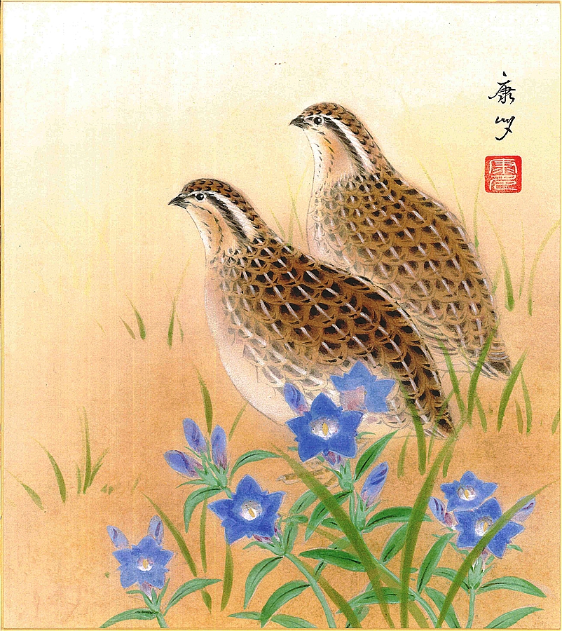 色紙(秋)中西 康多作画「鶉にりんどう」 色紙寸法24.2X27.2cm