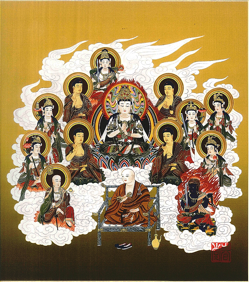 現代仏壇用硯屏(工芸色紙) 「真言十三佛」 額縁寸法24X27cm