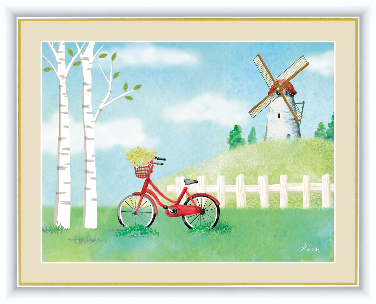 絵画 高精細デジタル版画 インテリア 壁掛け 額縁付き 青木 奏作 「自転車と風車」 F6