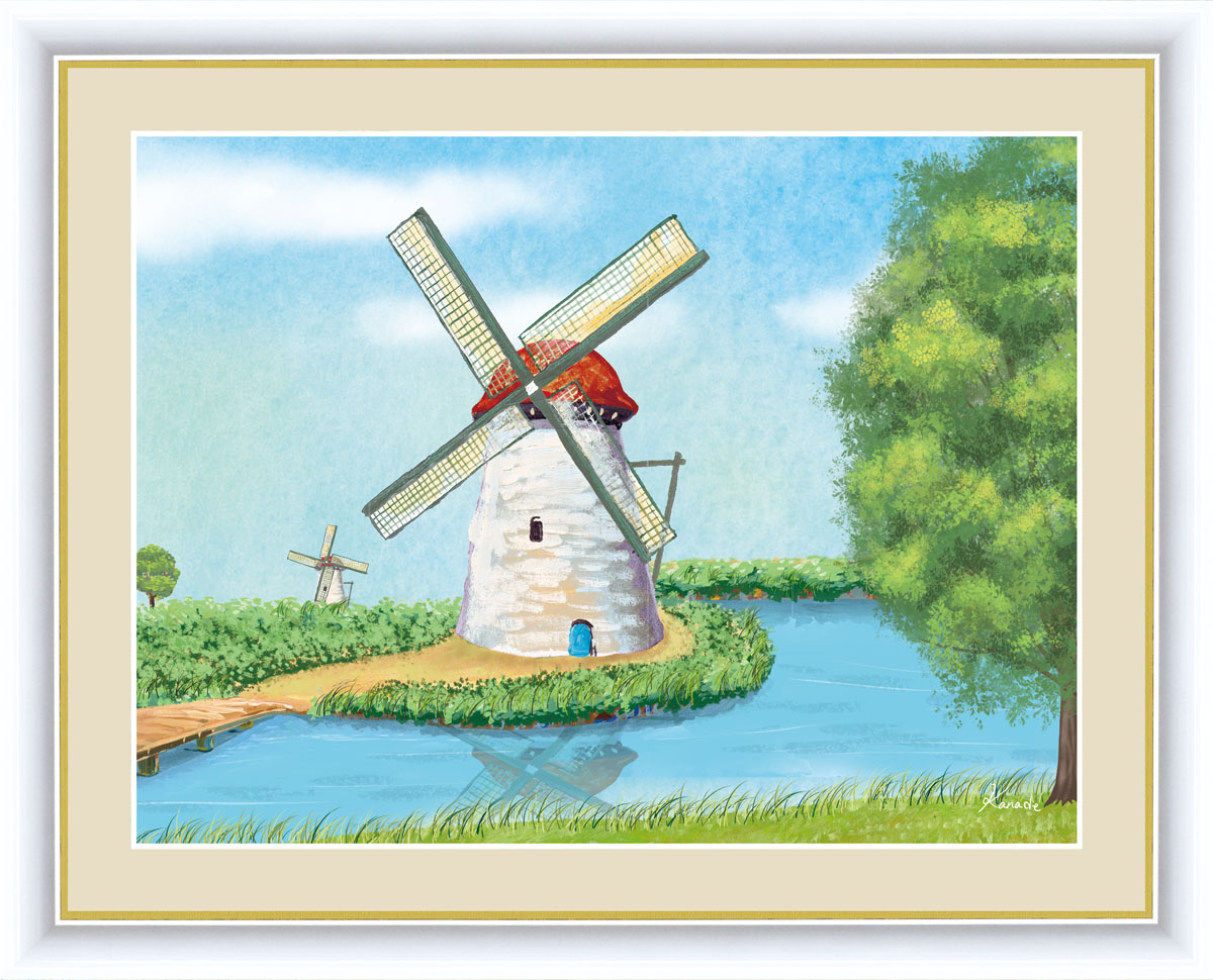 絵画 高精細デジタル版画 インテリア 壁掛け 額縁付き 青木 奏作 「水辺の風車」 F4